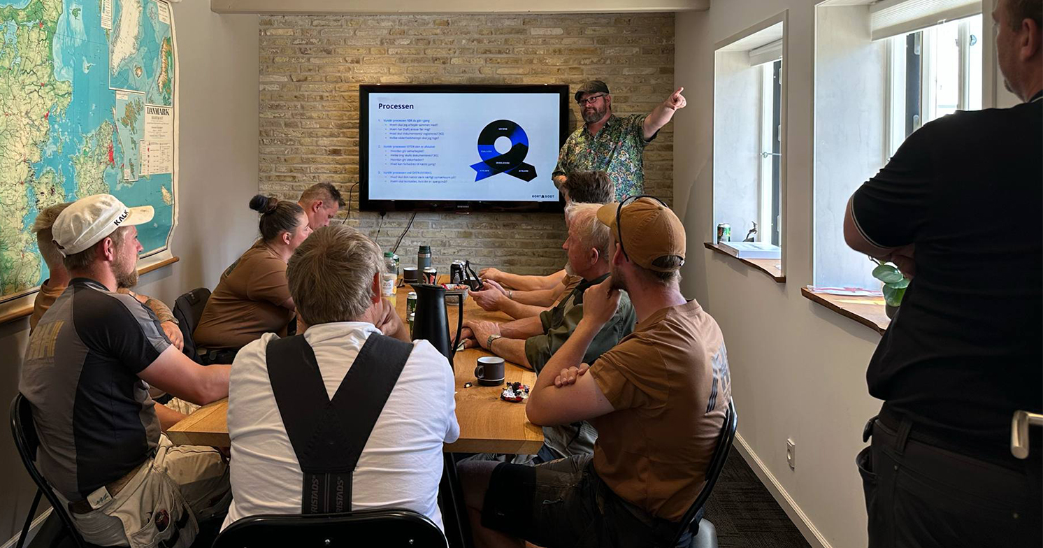 Foto: Mads Okking præsenterer samarbejdsværktøjet Kort & Godt for medlemsvirksomhed på Fyn, juni 2025.